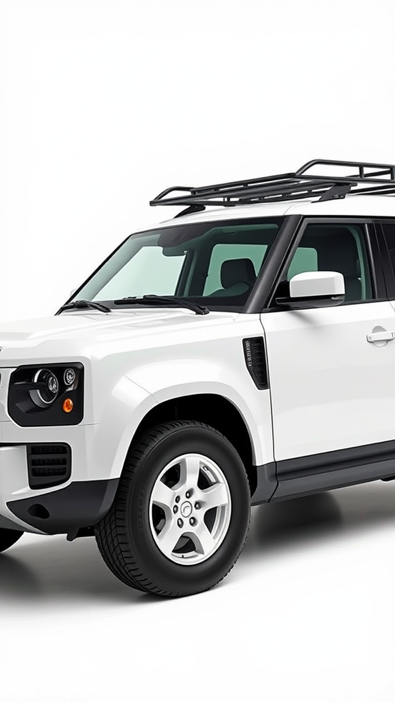 The artwork is a portrait of a sleek white SUV with an elegant roof rack, standing proud in the spotlight. This piece, reminiscent of creations by Richard Carline, draws inspiration from Renaissance art, evoking a sense of timeless exploration. The vehicle is portrayed in a hyper-realistic style, suggesting it's set for an exciting safari adventure. Against a pristine, white background, the focus on the SUV is sharpened, allowing viewers to appreciate its intricate details. The style recalls the 90s, similar to the popular Discovery One SUV, yet with a modern twist. Utilizing a Polaroid octane render technique, the image boasts a cinematic 16:9 aspect ratio, perfect for wall display. This iconic adventure vehicle, depicted in a dynamic half-turn position, celebrates exploration, perhaps marking a significant anniversary or achievement. The artwork captures both the power of the SUV and the spirit of adventure it embodies.