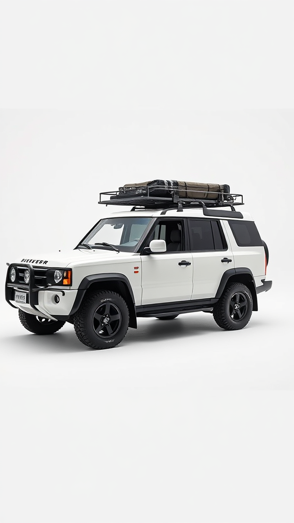 The artwork is a portrait of a sleek white SUV with an elaborate roof rack, reminiscent of an exploration-ready companion. Inspired by the charm of Renaissance art and potentially crafted by Richard Carline, this image seamlessly infuses modern hyper-realistic style with nostalgic elements from the 90s, particularly echoing the spirit of the renowned Discovery One SUV. Positioned on an immaculate white backdrop, the vehicle is captured in exquisite detail, its half-turn stance imbued with the thrill of a safari adventure. Created in a Polaroid octane render, the image is framed in a 16:9 aspect ratio, celebrating the iconic status of the SUV in adventure gear. The artwork, perhaps marking a milestone or special occasion, is perfect for wall display, inviting viewers to admire the harmonious blend of classic inspiration and contemporary artistry.