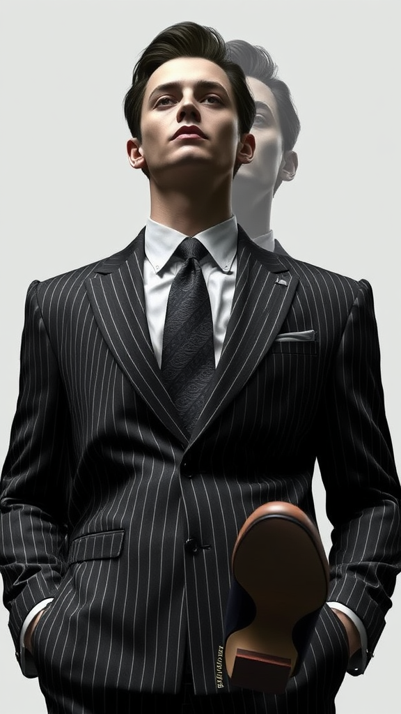 The artwork is a testament to meticulous craftsmanship, capturing every detail with precision—from the sleek pinstripe suit to the delicate stitching on the shoes. Each aspect is rendered to perfection, creating a striking masterpiece that captivates and inspires. However, the 3D CGI depiction includes deliberate errors such as low resolution, text distortions, and cropped elements that contribute to a surreal, almost abstract composition. Despite intentional flaws—like duplicated features, morphed figures, and anatomical quirks—the piece maintains its core essence, playing with the boundaries between beauty and the unconventional.