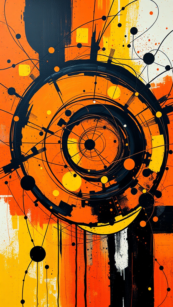 The artwork is a vivid composition of orange, black, and yellow hues, infused with intricate patterns and subtle hints of dark white and light red. This piece draws inspiration from circular abstraction and the innovative style of Dmitry Spiros, utilizing industrial materials to create a unique texture. The painting features balanced proportions with a nod to hard-edge painting techniques, resulting in a captivating blend of structure and fluidity.