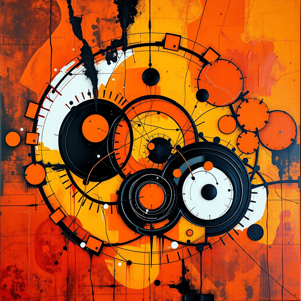 The artwork is crafted in a harmonious blend of orange, black, and yellow hues, embodying a style of intricate compositions with dark white and soft red tones. It features circular abstraction reminiscent of Dmitry Spiros, utilizing industrial materials and showcasing balanced proportions with hard edge painting techniques, evoking a dynamic yet controlled aesthetic.