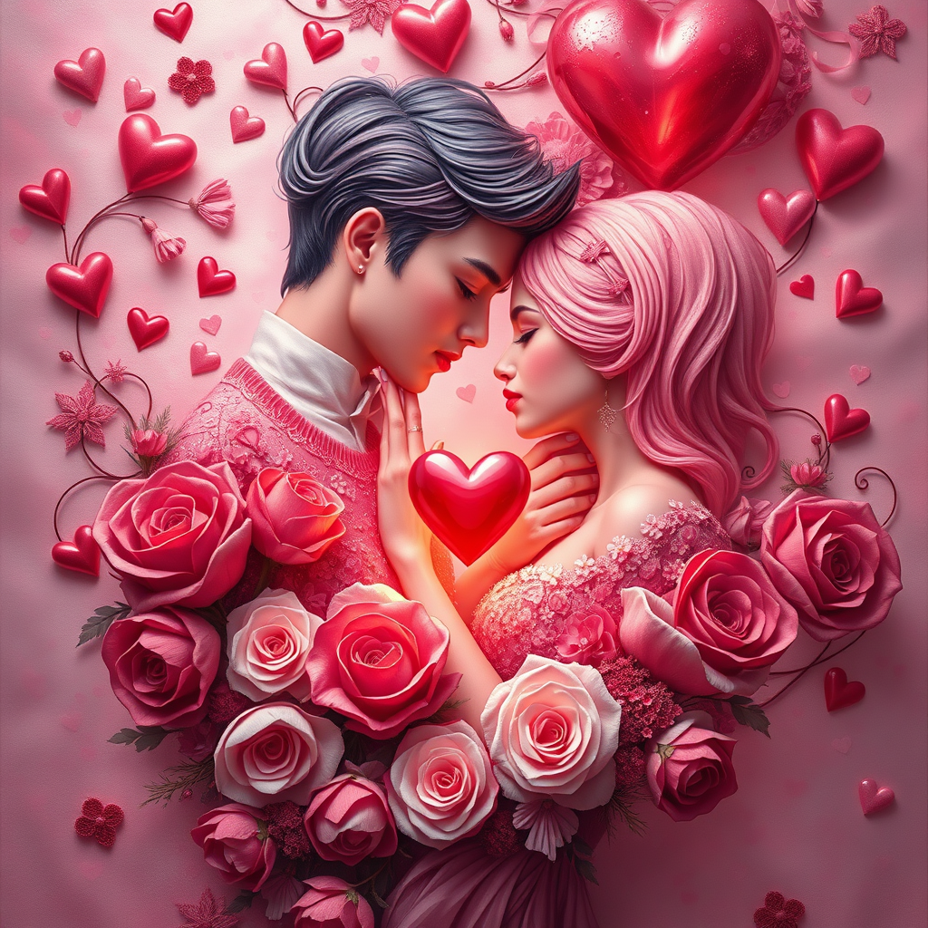 The artwork is crafted in an ultra-realistic manner, meticulously detailing every element to inspire awe and wonder. The palette is rich and vivid, with an emphasis on pink and red tones that beautifully capture the romantic essence of Valentine's Day. The overall composition evokes a sense of enchantment and emotional depth, inviting viewers to immerse themselves in its captivating allure.