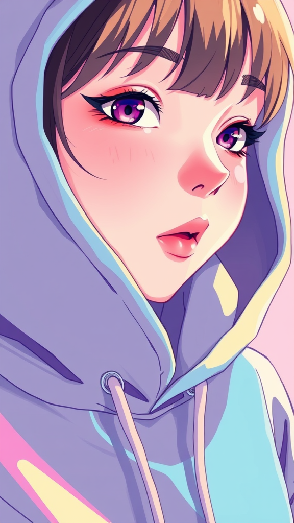The artwork portrays a close-up of an individual in a hoodie, drawing inspiration from digital artist Yanjun Cheng as well as fellow creators Beeple, Rhads, and Lois van Baarle. Presented in a cartoon-like style, the illustration bursts with vibrant pastel hues, capturing the essence of a retro anime girl while incorporating a dreamy, ethereal quality.