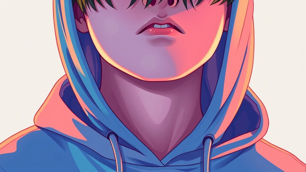 The artwork portrays a vibrant close-up of an individual donning a hoodie, drawing inspiration from digital artists like Yanjun Cheng, Beeple, Rhads, and Lois van Baarle. The illustration embodies a playful, cartoon-like aesthetic with an array of bright pastel shades, crafting a stunning piece that evokes the feel of a nostalgic anime character. The image retains its whimsical charm while incorporating unique touches to enhance the retro anime vibe.