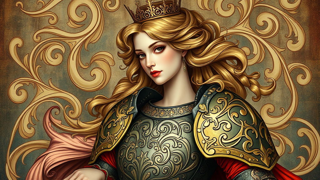 The artwork presents a mesmerizing blend of artistic styles, weaving together the intricate elegance of Art Nouveau with the lavishness of Baroque and Rococo. The Princess’s armor showcases the sinuous lines and natural motifs characteristic of Art Nouveau, while the composition as a whole exudes the rich detail and ornate splendor associated with Baroque and Rococo influences. Swirling patterns intertwine with sumptuous forms, creating a scene of visual opulence and sophistication.