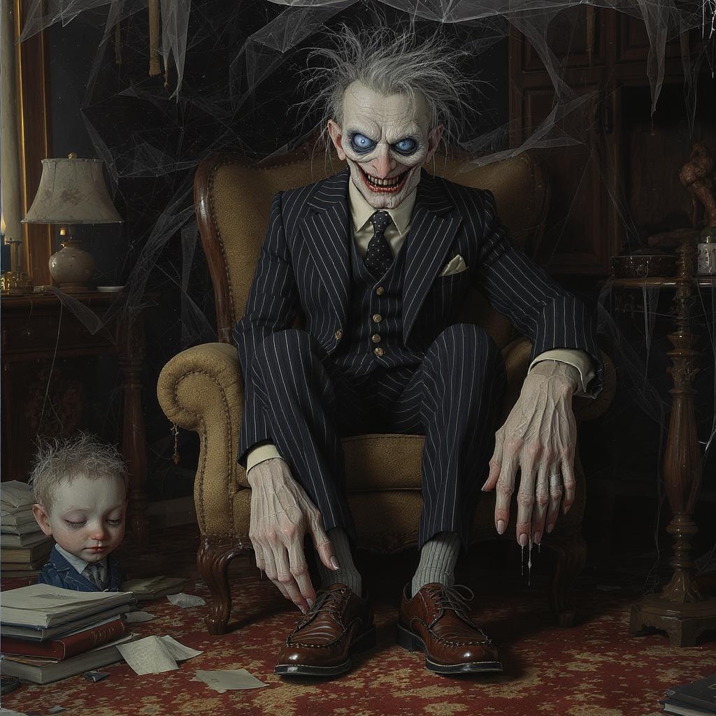 The artwork presents an astonishing level of craftsmanship, where each component is intricately designed, from the subtle finesse of the pinstripe suit to the elaborate detailing of the shoe's stitches. The meticulous attention to detail culminates in a stunning masterpiece that captivates and impresses every observer. Despite being rife with imperfections, such as low resolution, rendering errors, and awkward proportions, there is a haunting charm in its morbid imperfections. The piece features uncanny renderings like disfigured faces, blurred outlines, and anomalous limb formations, yet these distortions only enhance its provocative allure. The composition treads the line between unsettling and fascinating, inviting a deeper reflection on the imperfections inherent in art.