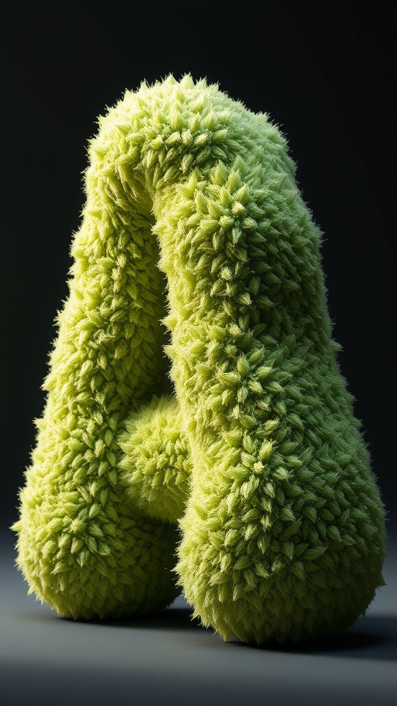 The avocado-textured letter A, intricately designed as a fluffy 3D sculpture, crafted with high realism using blender and unreal engine, showcasing vivid details and high quality, enveloped in soft, atmospheric lighting, with slight creative variations in color and texture for an artistic touch, set against a contrasting background to enhance depth and volume, simulating a tactile experience that draws the viewer in.