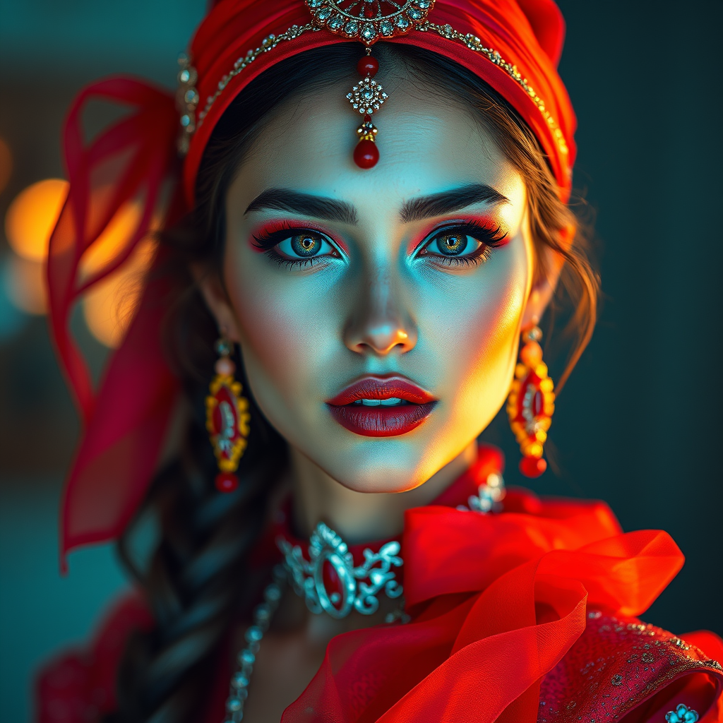 The azure enchantress adorned in a vibrant ensemble, capturing the essence of Brandon Woelfel's dreamlike photography and Becky Cloonan's illustrative storytelling, featuring ultra-high definition clarity, suffused with shades of light crimson intermingling with bright red, under the glow of luminescent lightscapes reminiscent of Tanya Shatseva's ethereal art. The image focuses on a close-up captured with a Fujifilm X-T4 and a Sony FE 85mm f/1.4 GM lens, presenting the subject in a 45:56 aspect ratio, expressed in a raw style.