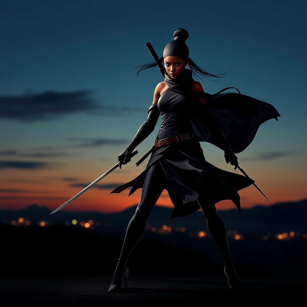 The bounty hunter exudes elegance and power, her captivating visage a harmonious fusion of African and Asian heritage. Standing tall and lean, her movements are fluid and precise, each step a testament to her prowess. Draped in a sleek ninja ensemble, she is a striking silhouette against the horizon, her long legs granting her unparalleled agility in combat. Her mere presence commands attention, a work of art in motion.