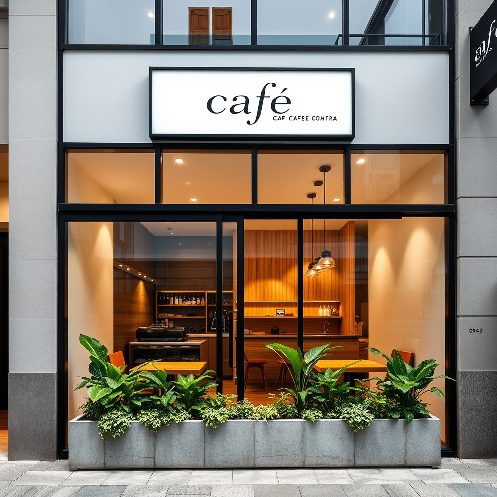 The cafe facade features a sleek, glass-paneled front with a large sliding door entrance, framed by thin matte black metal edges. Above, a simple and elegant monochrome sign displays the cafe name in contemporary sans-serif lettering. Along the base, a low concrete planter box hosts a selection of lush, green plants that soften the modern lines. Inside, warm ambient lighting spills through the glass, reflecting off natural wood accents visible in the interior, inviting passersby to a cozy yet sophisticated atmosphere.