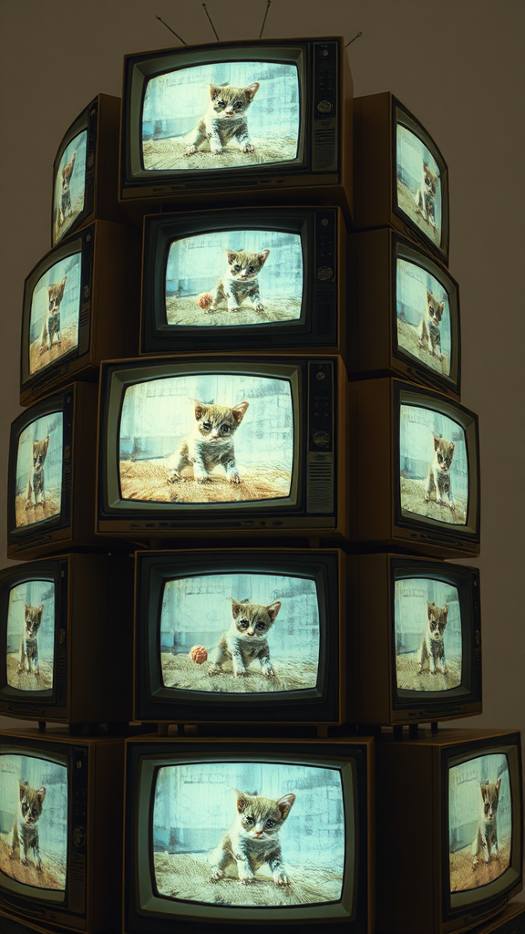 The camera glides around a towering sculpture made of vintage televisions, each screen flickering with the same looped footage of a playful kitten chasing a ball of yarn, their faded colors and static adding a nostalgic charm to the synchronized display.