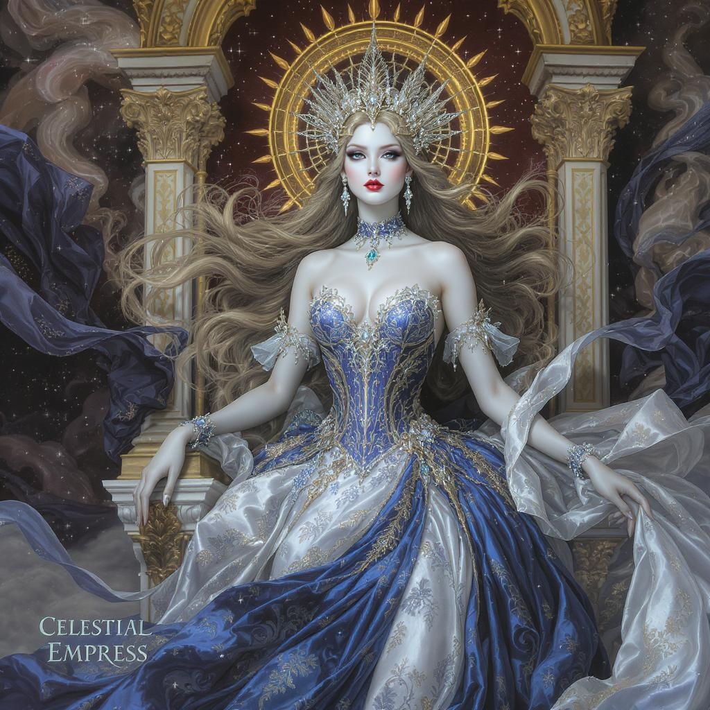 The celestial empress captivates all with her resplendent presence; her gown flows with a mystical array of deep indigo and silver, decorated with intricate lace patterns and studded with glimmering jewels. Her cascading hair tumbles down her back in waves that catch the light, framing a visage of sublime beauty and elegance. Imagined by renowned hyper-realistic artist Kazuhiro Tsuji, this artwork blends Baroque and Art Nouveau influences with an exquisite eye for detail, creating a stunning masterpiece that mesmerizes all who behold it.