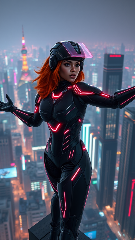 The cinematic scene unfolds with a striking black woman with vivid ginger hair, poised confidently atop a towering skyscraper under the neon-lit night of Neo-Tokyo. Her posture is heroic, arms outstretched as if embracing both the power and responsibility her role entails. Clad in sleek, angular armor, vibrant neon lines pulse rhythmically along its contours, reflecting the advanced technology she embodies. Behind her, the cityscape stretches out endlessly, a dazzling mixture of towering buildings and swift, flying cars that zip by with a whisper of high-tech sophistication. As the camera focuses on her determined expression, a holographic interface projects gently from her helmet, casting a digital glow on her features as she meticulously scans for trouble amidst the urban sprawl below. The aesthetics draw heavily from the cyberpunk genre, reminiscent of Blade Runner's gritty realism combined with the heart-pounding action and intensity of Starship Troopers and Dredd, infused with the imaginative touch of a Pixar narrative. This unique vision, expertly helmed by directors Ridley Scott and Ava DuVernay, is a masterpiece in photorealistic and hyperrealistic filmmaking, offering a compelling journey through a meticulously detailed world. With a spotlight on a robust and inspiring black female lead, the film promises a blend of breathtaking visuals and relentless storytelling.