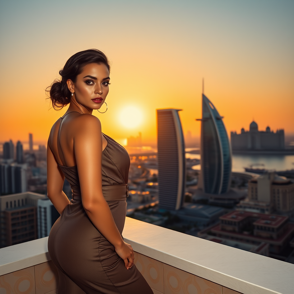 The Cinestill Hasselblad 85mm camera captures a stunning movie still of a statuesque woman in a chic outfit, standing confidently on a balcony with a breathtaking view of Dubai at sunset. The warm glow of the setting sun highlights her determined expression and the city's impressive skyline. The composition follows the Golden Ratio, emphasizing her strength and presence. In the distance, the silhouette of a grand villa suggests the potential hideout of an antagonist. The photograph is shot in ultra-high-definition 8k, blending photorealistic and cinematic qualities that draw viewers into the scene. It's hyperdetailed with intricate skin textures, soft lighting, and heavy shadows, all captured in a high-quality analog style.