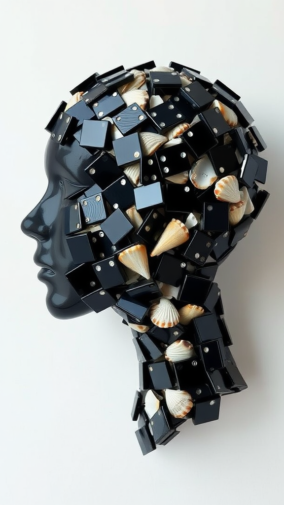 The composition depicts a woman's head intricately formed from glossy black domino pieces interwoven with fragmented sea shells, evoking a blend of octopath traveler aesthetics and vanitas themes. The structure is angular and embodies altermodern surrealism, showcasing an elegant yet abstract form where the interplay of the materials creates a sense of both fragility and resilience. The shiny surface of the domino pieces contrasts with the textured, iridescent quality of the shells, adding layers of depth and complexity to the overall appearance.