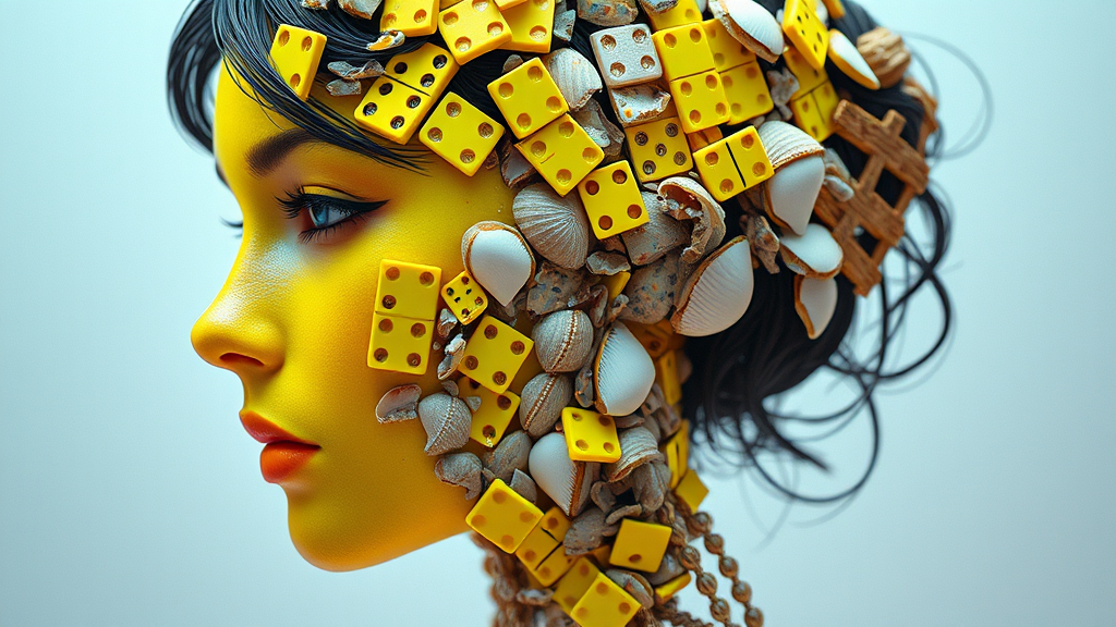 The composition depicts a woman's head intricately crafted from fluorescent yellow domino pieces and shattered sea shells, exuding an Octopath Traveler aesthetic. The design evokes a vanitas theme, with angular features embodying altermodern and surreal qualities. The scene blends vivid colors and intricate textures, with an emphasis on raw style, capturing a sense of transience and transformation in a beautifully surreal and imaginative portrayal.