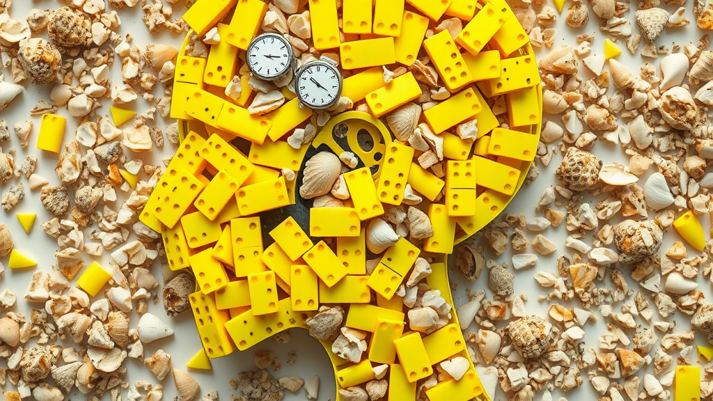 The composition features the anatomy of a woman's head crafted from fluorescent yellow domino pieces interspersed with crushed sea shells. The scene is inspired by Octopath Traveler, embracing a vanitas theme, with an angular, surreal twist that encapsulates the essence of altermodern art. The intricate structure melds the calculated precision of domino arrangements with the organic chaos of fractured shells, creating a striking juxtaposition in vibrant contrast. This visual spectacle unfolds in a raw, unrefined style, inviting contemplation of the transient yet interconnected nature of existence.