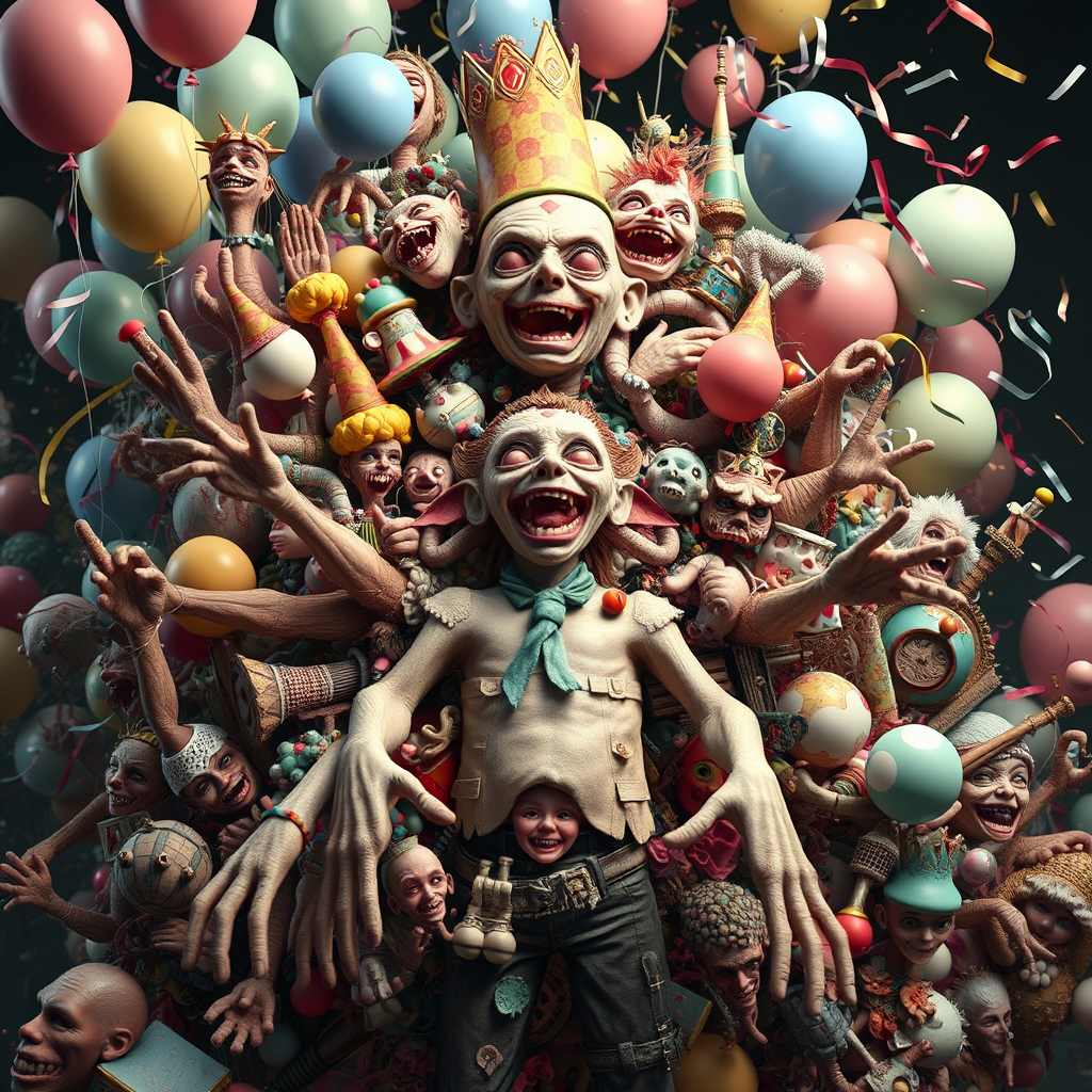 The composition is an exuberant display of hyper-maximalist techniques, showcasing a myriad of intricate details and embellishments. The foreground is teeming with an abundance of objects and symbols, each contributing to the overall sense of joy and playfulness. From balloons and ribbons to hats and confetti, the scene bursts with a cascade of colors and dynamic movement. cgi, 3d, figure, octane, render, pixelated, text, cropped, low resolution, jpeg artifacts, unattractive, duplicate, eerie, distorted, out of frame, extra digits, mutated hands, poorly drawn hands, distorted face, mutation, deformed, fuzzy, emaciated, incorrect anatomy, disproportionate, additional limbs, repeated face, disfigured, awkward proportions, malformed limbs, missing limbs, additional appendages, fused fingers, numerous fingers, extended neck.