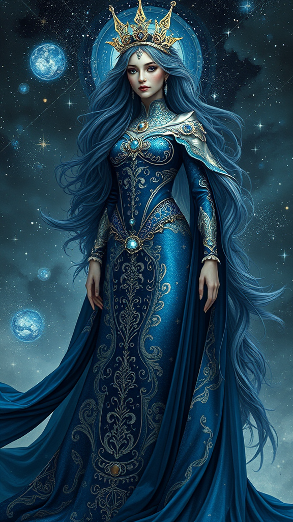 The cosmic princess stands as a vision of splendor, her flowing gown shimmering with celestial hues of midnight blue and silver, adorned with intricate embroidery and embellished with twinkling gemstones. Her long hair cascades like a waterfall of stardust, framing a face that exudes pure beauty and elegance. Created by the masterful hyper-realistic artist, Kazuhiro Tsuji, this artwork blends elements of Renaissance and Art Nouveau styles with painstaking attention to detail, resulting in a stunning masterpiece that leaves the observer breathless.