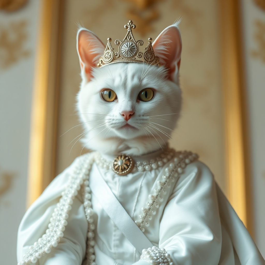 The cosplayer is a white cat playing the role of an intricately detailed royal figure, captured in 8k sharp focus, exhibiting elegance and grace. The depiction features an immaculate portrayal, emphasizing realistic anatomy with perfectly coordinated body positioning. The composition is centered and harmonious, highlighting the feline's regal demeanor and distinct personality. The scene is vivid, maintaining clarity and focus with no extraneous elements, ensuring a captivating and authentic representation of the regal persona.