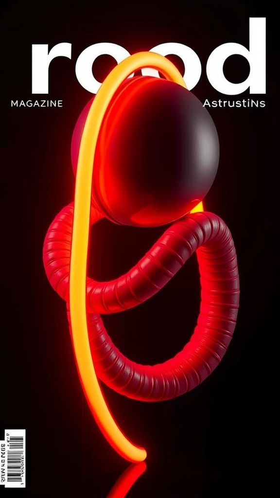 The cover art of Rood Magazine features a sphere and a worm intertwined with a vibrant, glowing red light, presented in the style of conceptual portraiture. The elements appear crafted from rubber, invoking the sleek aesthetic of futuristic robots, combined with inspirations from Elina Karimova's work. The scene is dominated by a light black backdrop, emphasizing technology-based art. Objects are depicted as oversized, lending a surreal quality, and the artwork captures the essence of raw, avant-garde creativity.