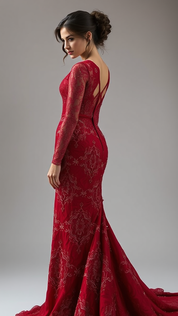 The crimson gown is a true marvel, with each detail thoughtfully curated. Delicate lace patterns and strategically placed bead embellishments embody expert craftsmanship, evoking a sense of awe and enchantment. This unique creation stands alone as an unparalleled masterpiece.