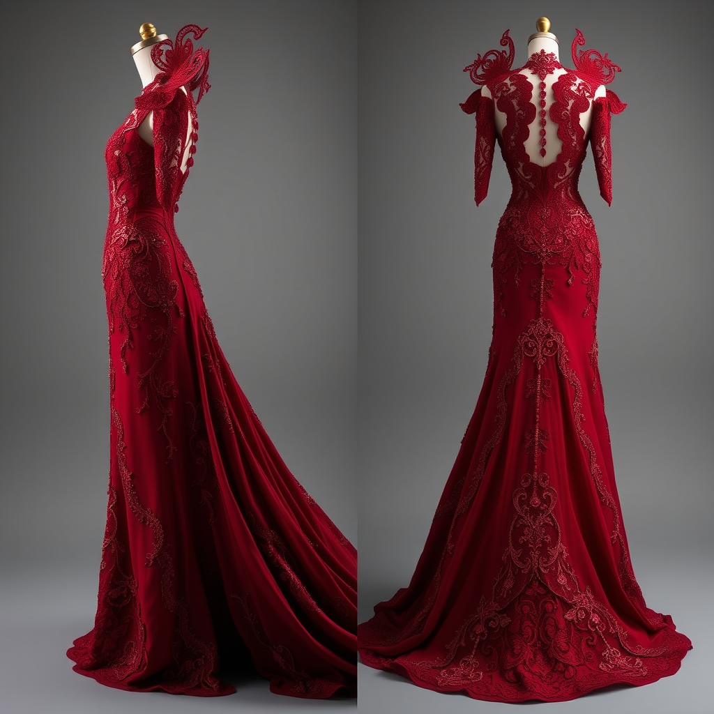 The crimson gown is a true work of art, with each detail meticulously crafted. From the delicate lacework to the strategically placed beadwork, every component has been artfully designed to evoke a sense of fascination and admiration. It stands as a unique and original creation, unparalleled in its singularity. This exquisite piece embodies remarkable craftsmanship, transforming it into a genuine masterpiece that captivates and inspires.