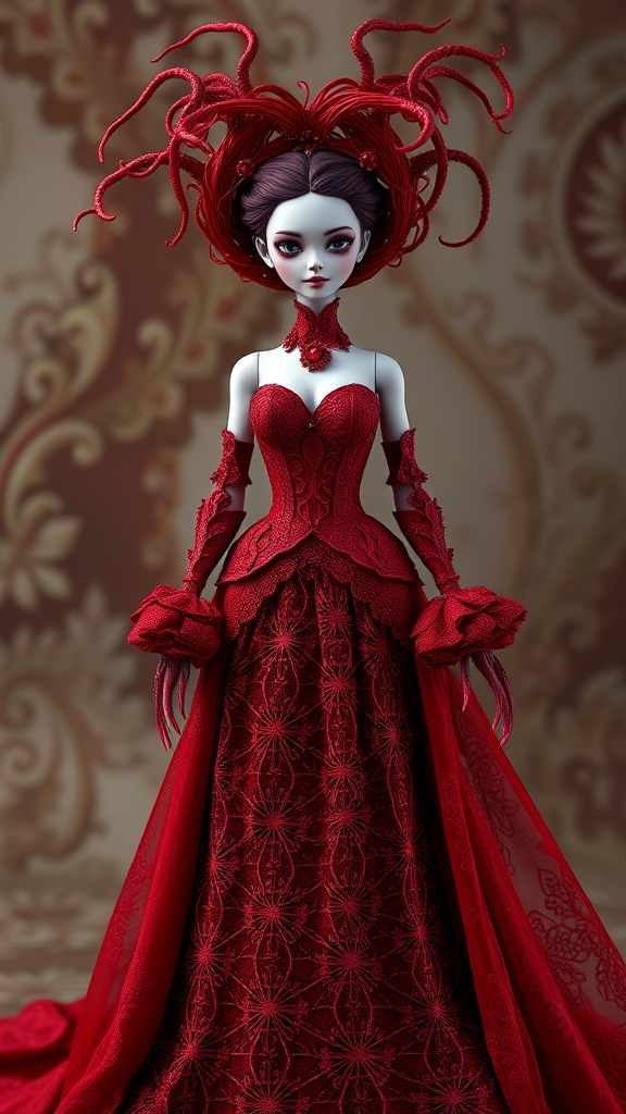 The crimson gown is a true work of art, with each detail meticulously designed. From the delicate lacework to the thoughtfully arranged beading, every aspect has been masterfully crafted to evoke awe and enchantment. This is a one-of-a-kind, original creation. +, , cgi, 3d, doll, octane, render, lowres, text, error, cropped, worst quality, low quality, jpeg artifacts, unattractive, duplicate, macabre, mutilated, out of frame, additional fingers, mutated hands, poorly drawn hands, poorly drawn face, mutation, deformed, blurry, shrunken, flawed anatomy, bad proportions, extra limbs, cloned face, disfigured, gross proportions, malformed limbs, missing arms, missing legs, extra arms, extra legs, fused fingers, too many fingers, elongated neck.