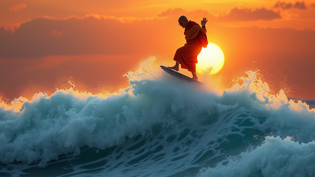 The Dalai Lama gracefully rides atop a towering wave, balancing effortlessly as the sun sets behind him, casting a golden glow over the frothy ocean spray.