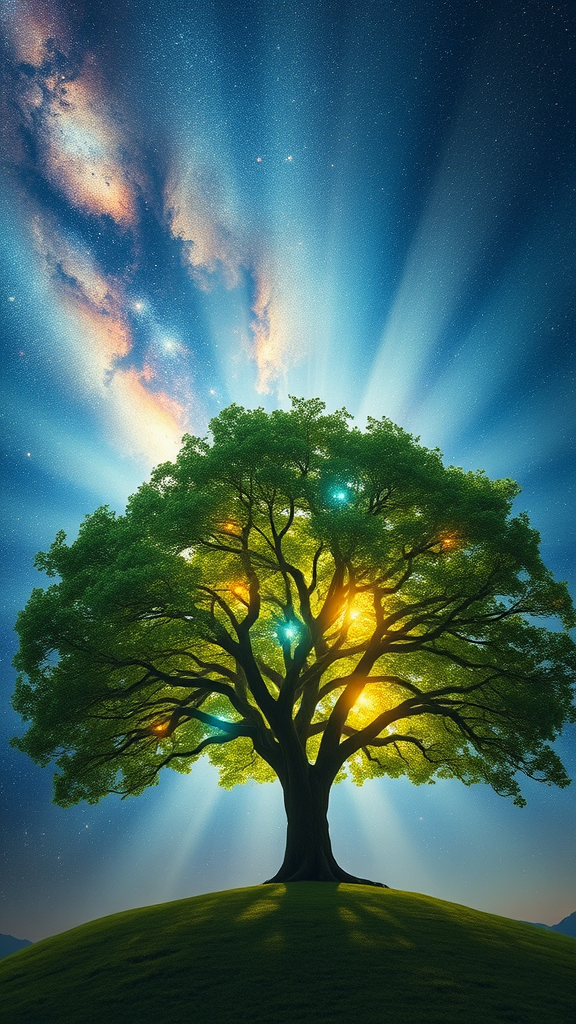 The dawn of existence, a verdant Tree emanating vibrant and kaleidoscopic streams of light against a majestic cosmic sky, rendered with professional color grading, gentle shadows, minimal contrast, and sharp clarity, reminiscent of cinema film photography, in ultra-high resolution, hyper-realistic detail. Encompassing nebula elements and the perspective of a wide-angle lens, conveying an ethereal depth without visual obstructions such as mountains.