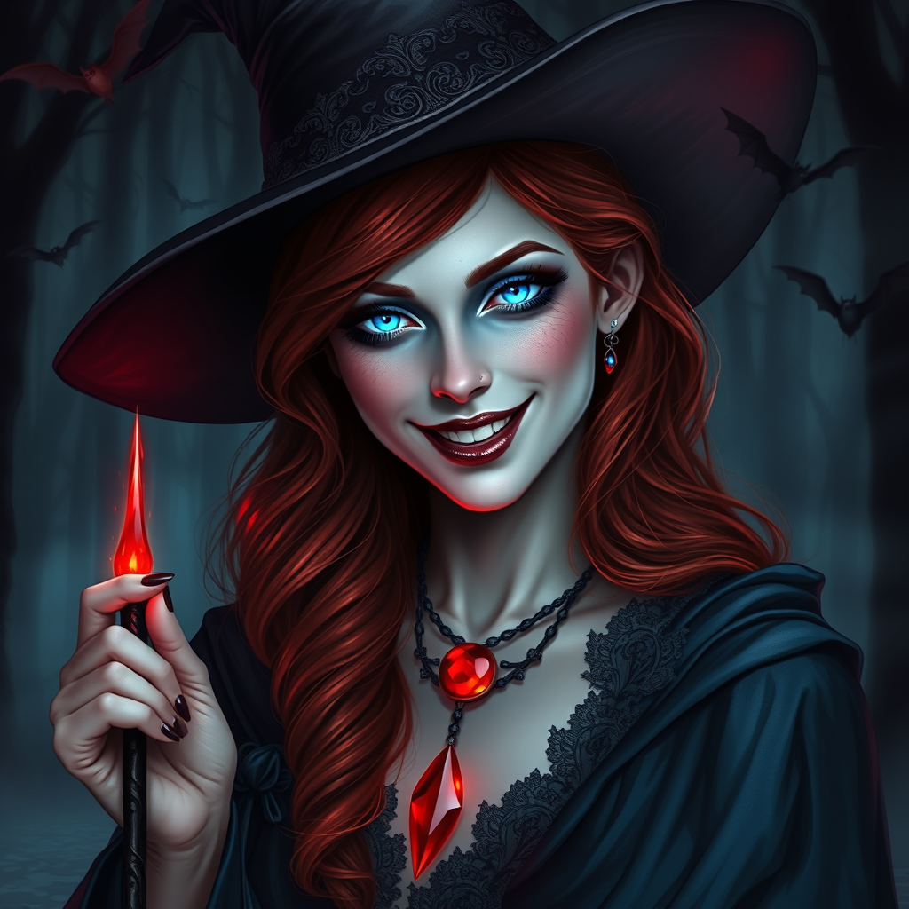 The digital fantasy artwork depicts a captivating witch with ethereal features. The central figure is a woman with alabaster skin and fiery red hair cascading in loose waves. She wears an elegant, pointed witch's hat adorned with silver embroidery, and draped over her shoulders is a flowing cloak accented with intricate lace. Her eyes shimmer with an electric blue light, and she flashes a grin revealing delicately pointed fangs. In her right hand, she wields a wand that pulsates with a crimson glow. Around her neck is a delicate, obsidian choker with a glowing crimson gemstone pendant. The backdrop is a shadowy, mist-laden forest where the silhouettes of bats dart through the air, amplifying the mystical and haunting ambiance. The color scheme is rich with deep tones and vivid red highlights, emphasizing the otherworldly essence of the scene.
