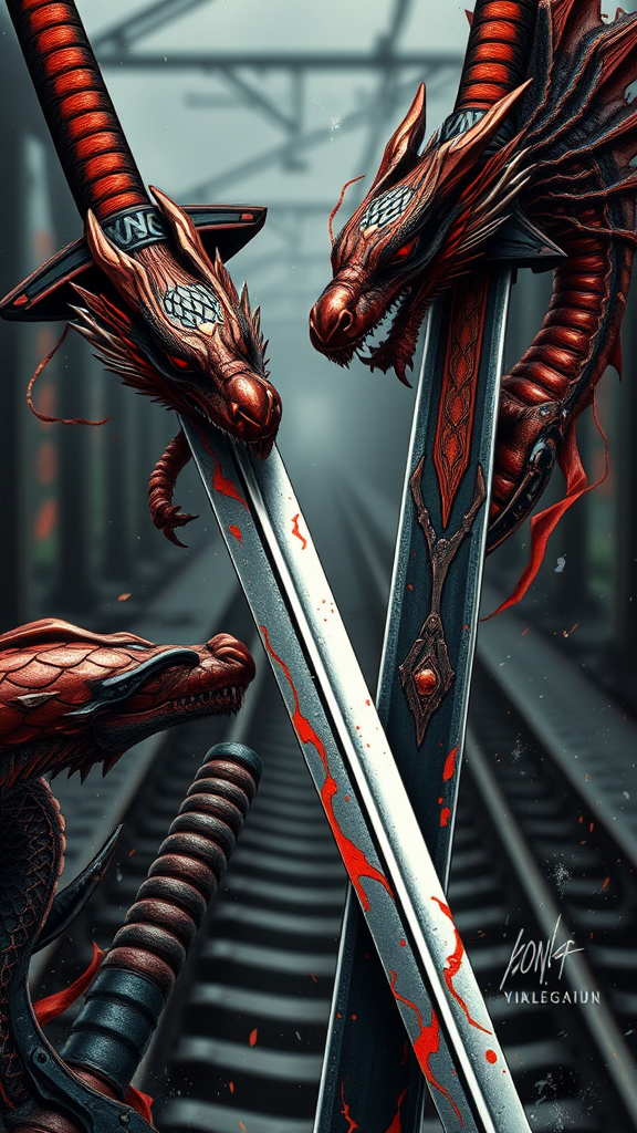 The dragonborn swords, depicted in a neo-traditional Japanese style with influences from Magali Villeneuve, showcase a close-up intensity. The design features urban and edgy elements reminiscent of Xiaofei Yue's work, in a palette of dark crimson and orange. Set against a gritty, traincore backdrop, these swords blend mythical elegance with modern street flair.