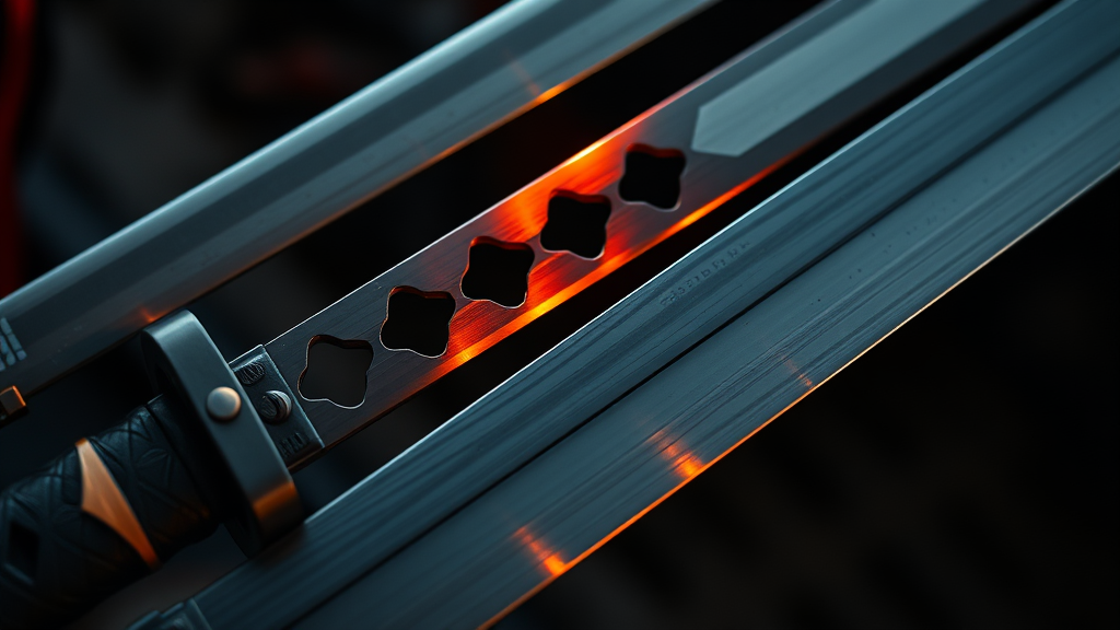 The dragonborn's blades, forged in the heart of urban legend, sharp and intense in a neo-traditional Japanese style, capturing the essence of Magali Villeneuve's artistry. Shadows play across the steel, reflecting dark crimson and vibrant orange hues, embodying the edgy spirit of Xiaofei Yue's work. Set against a background of traincore aesthetics, the craftsmanship is detailed and striking, each sword telling its own story of power and mystique. The close-up captures the intricate designs, blending ancient tradition with modern edge, creating a hauntingly beautiful fusion.