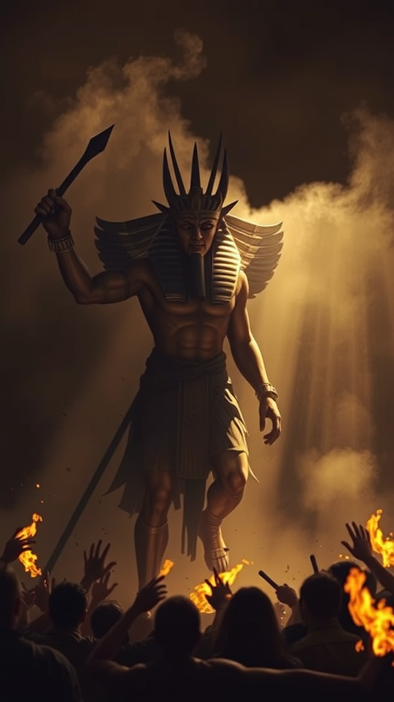 The Egyptian god Horus unleashes his fury upon humanity, casting an ominous shadow. Dark and foreboding, photorealistic, cinematic, dramatic scene.