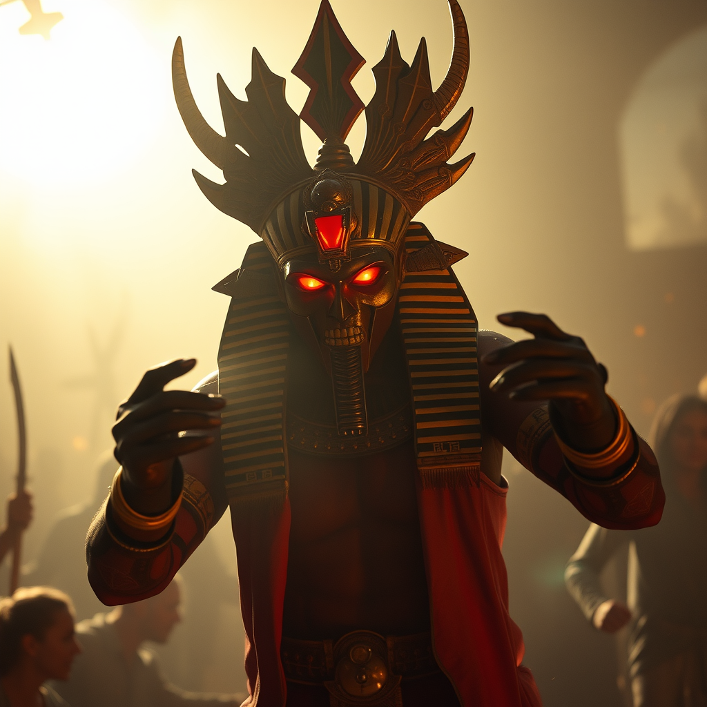 The Egyptian god Horus unleashes his fury upon humanity, casting a shadow of dread. Sinister and photorealistic with a cinematic full-length portrayal.