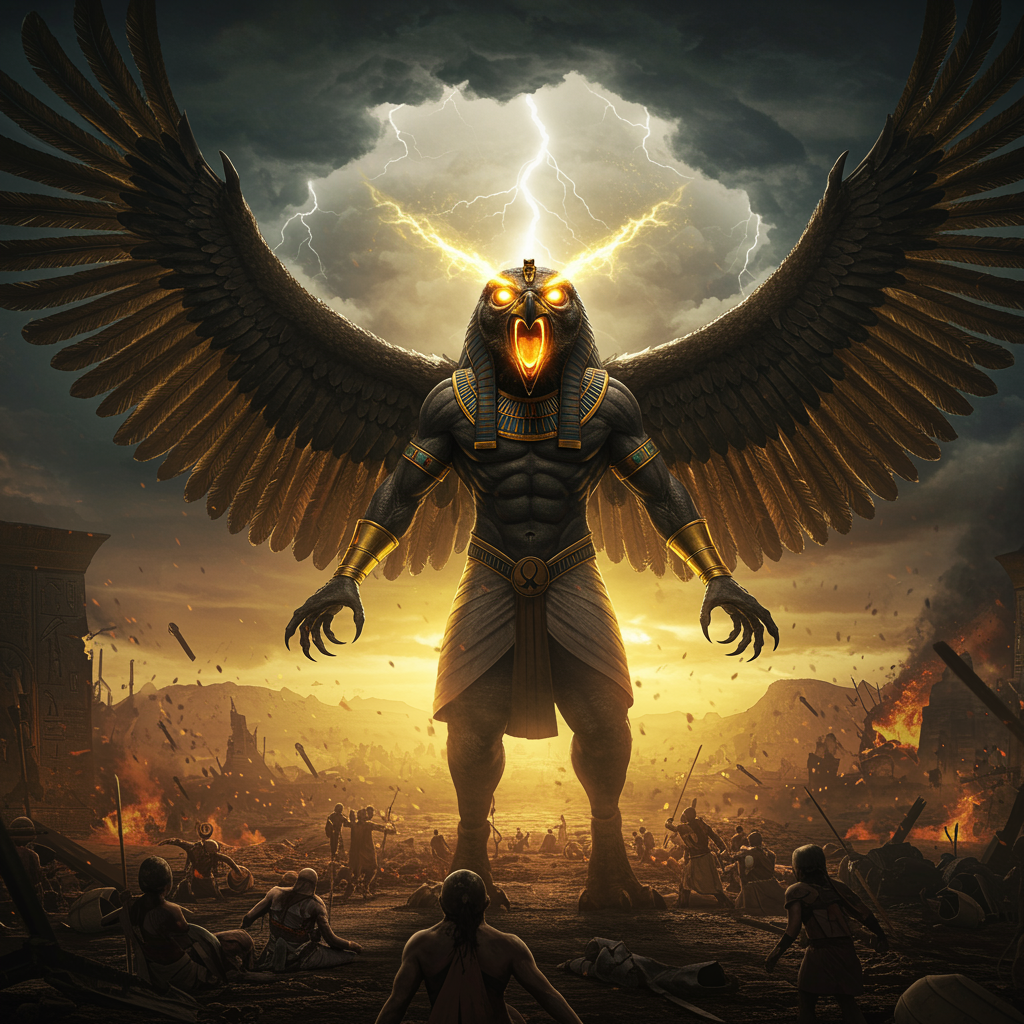 The Egyptian god Horus unleashes his vengeance upon humanity; a dark, foreboding presence. Dramatic, hyper-realistic, cinematic, capturing the full stature of his divine fury in intricate detail.