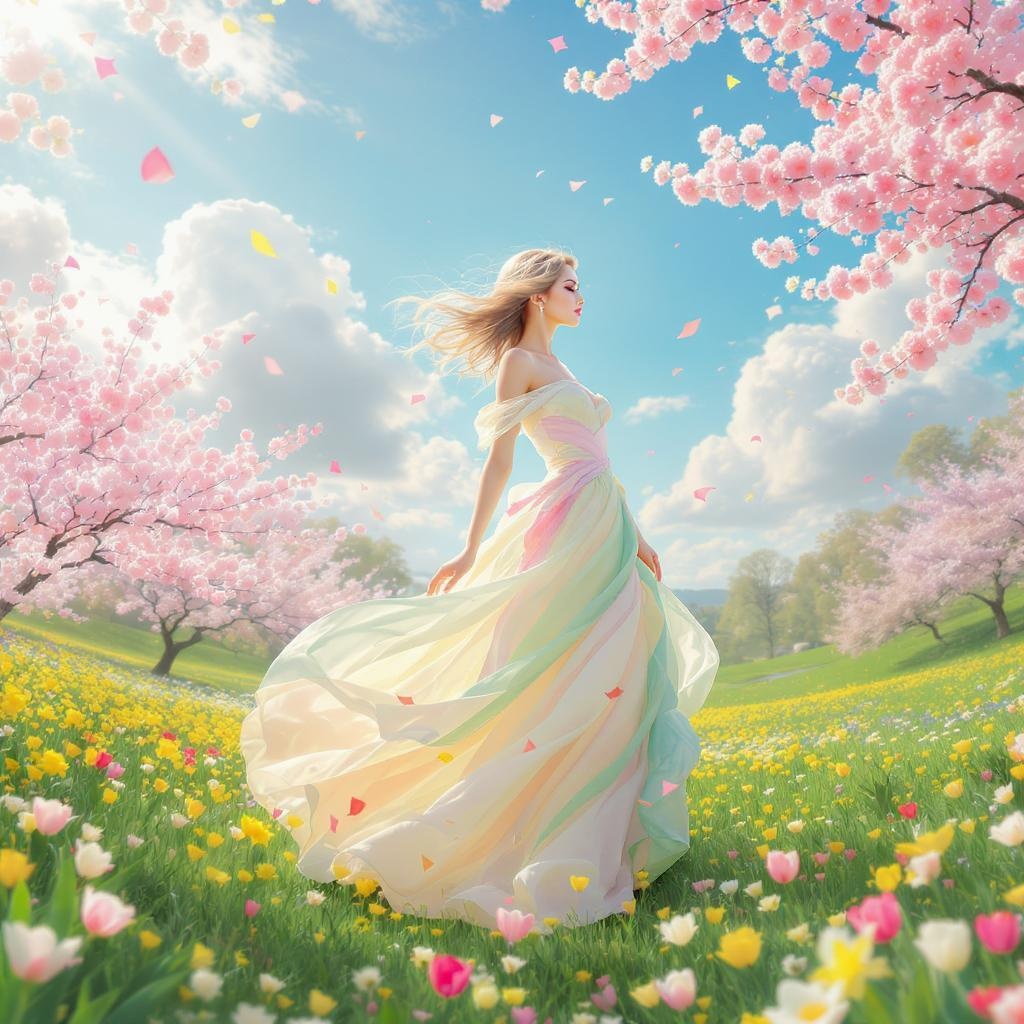 The embodiment of spring, a graceful figure exuding warmth and renewal, surrounded by a tapestry of blooming flowers and vibrant colors, gentle breezes swirling around. Their presence breathes life into the landscape, inspiring growth and vitality. A sense of rebirth and new beginnings permeates the air, as nature awakens from its slumber in a symphony of sights and scents.