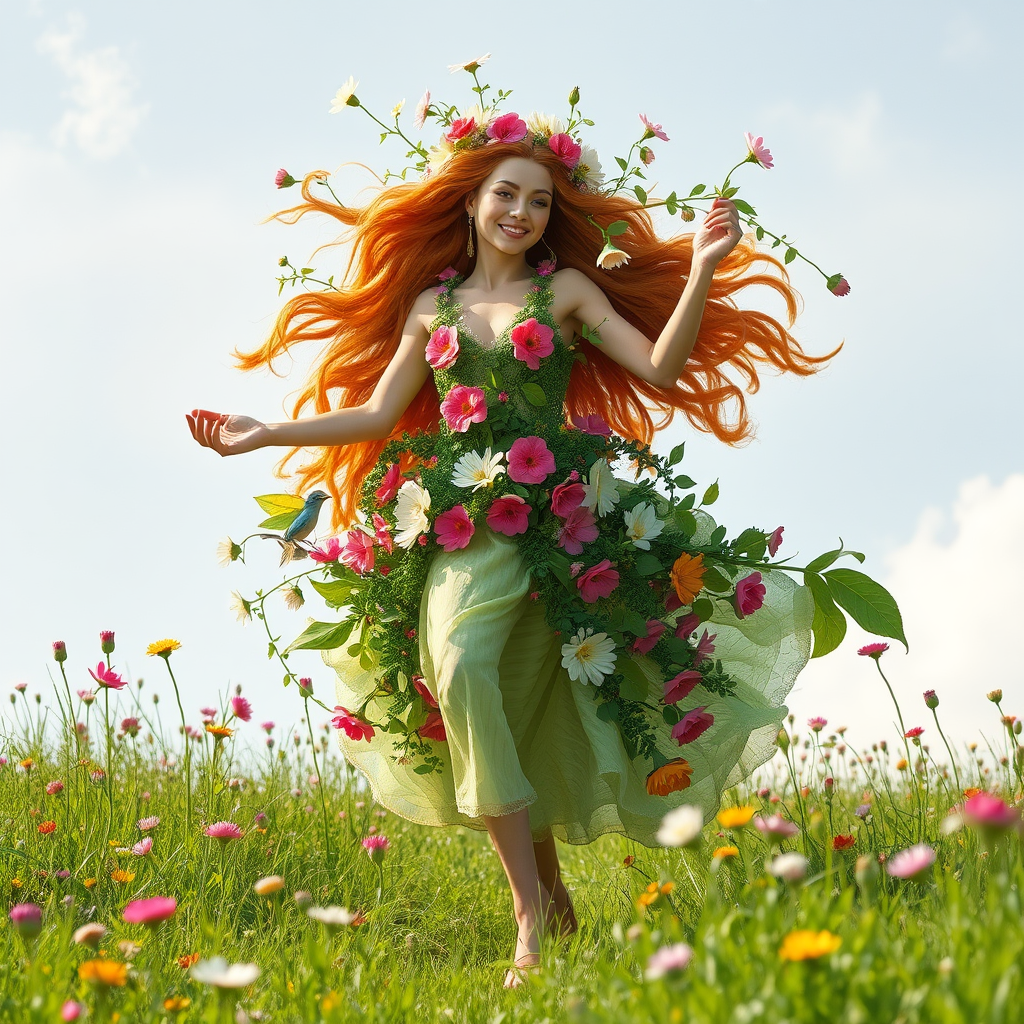 The embodiment of springtime: a lively and enchanting figure, adorned in vibrant hues of blooming flowers and lush greenery. Her presence brings renewal and warmth, as gentle breezes carry the fresh scent of new beginnings. Radiating vitality and joy, she dances through meadows, awakening nature from its slumber and painting the world in shades of life and hope. Her touch revitalizes the earth, and her smile is the promise of brighter days ahead, as she ushers in the season of growth and transformation.