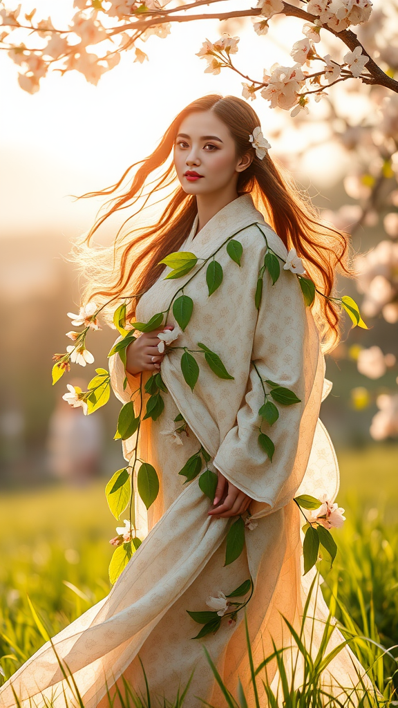 The embodiment of springtime, a radiant figure emerging with the first blush of dawn, wrapped in a gown of delicate cherry blossoms and fresh green leaves. Her eyes sparkle with the promise of renewal, and a gentle breeze dances around her, carrying the scent of blooming flowers and new grass. Sunlight filters through her hair, casting a warm, golden glow that brings life and vibrancy to the world around her. As she moves, the earth awakens, painting landscapes with color and filling the air with the sweet melody of birdsong—a joyful symphony heralding the joyful arrival of a new season.