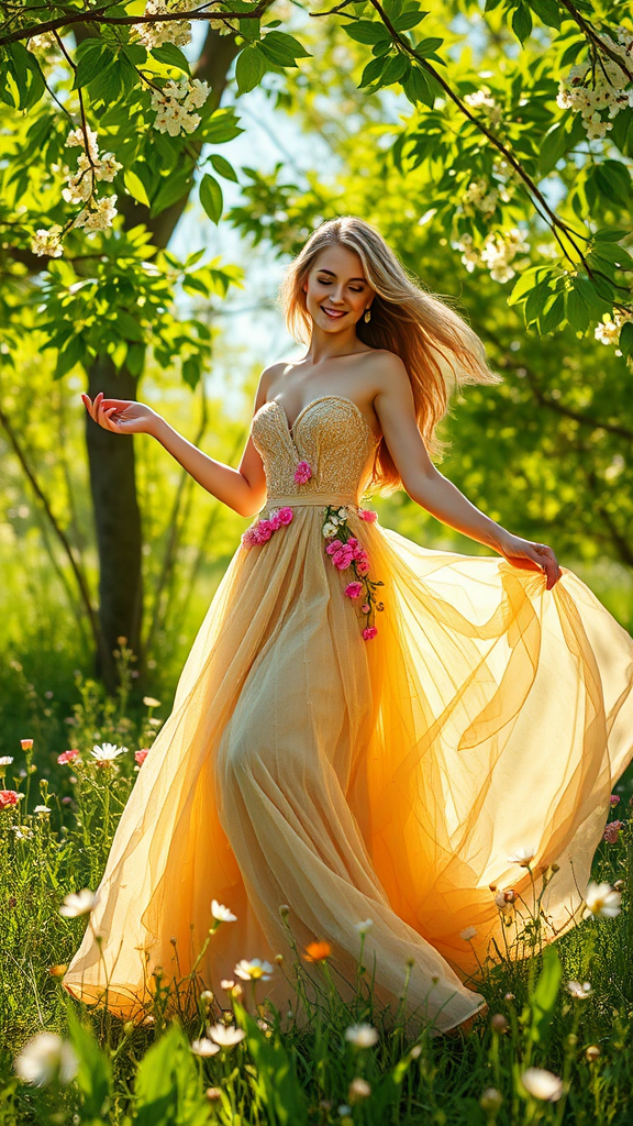 The embodiment of springtime as a graceful figure, surrounded by blossoming flowers and lush greenery, radiating warmth and renewal. Her gown flows like a gentle breeze, adorned with delicate petals and vibrant hues reminiscent of a blossoming meadow. A serene smile graces her face, reflecting the rejuvenation of the earth. Soft sunlight filters through the canopy of verdant leaves, casting dappled shadows and creating an atmosphere of hope and new beginnings. Whispering winds carry the scent of fresh blooms as she dances through the landscape, her presence a symbol of life awakening.