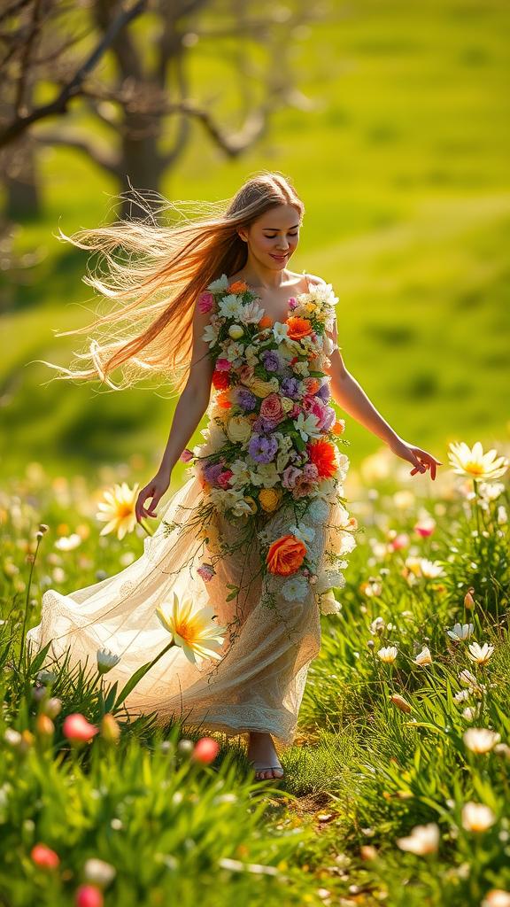 The essence of springtime embodied; a figure adorned in a tapestry of blossoming flowers, radiating warmth and renewal, moving gracefully through verdant landscapes bathed in soft sunlight, surrounded by gentle whispers of the wind, symbolizing hope and new beginnings.