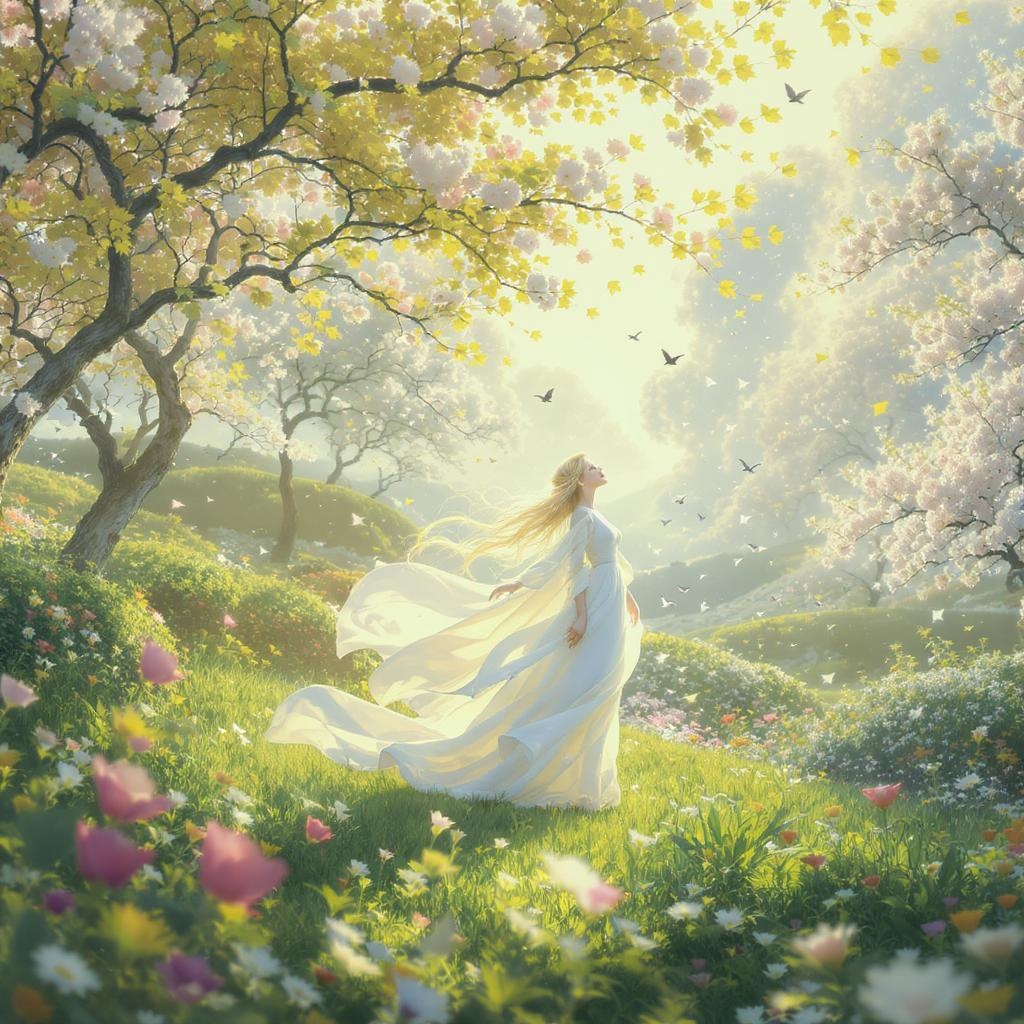 The essence of springtime personified, a figure embodying renewal and vitality, surrounded by blooming flowers and vibrant greenery. Their presence exudes warmth and a gentle breeze, breathing life into the landscape. Soft sunlight filters through budding leaves, casting playful patterns on the ground. The air is filled with the delicate scent of blossoms, while the sound of birds singing completes the scene of natural rebirth and harmony.