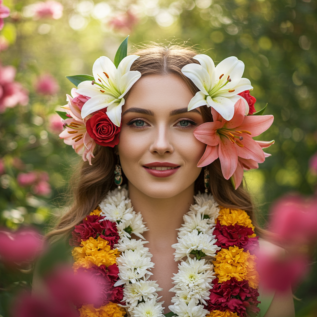 The essence of springtime personified, come alive with vibrant blossoms gently swaying in a soft, refreshing breeze, warm sunlight glistening through lush canopies, a serene smile spreading across an ethereal face, adorned with garlands of fresh lilies and roses, embodying renewal and the joyous awakening of nature.