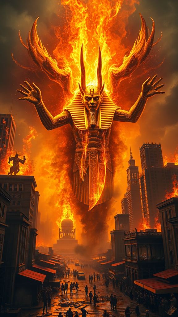 "The eternal pharaoh, Anubis, awakens with unforgiving fury, burning his divine wrath upon humanity, casting a dark and foreboding shadow over the crumbling metropolis, where the once-proud skyscrapers now pierce the sky like skeletal fingers, as the people cower in terror before the god's unyielding gaze, their pleadings ignored by the merciless deity, who stalks the city streets, unstoppable and unrelenting, his fiery presence consuming all in its path, leaving charred ruins and smoldering skyscrapers, as the world trembles before the might of the Egyptian god, Anubis, avenger of the ancient order, unshakeable and unforgiving"