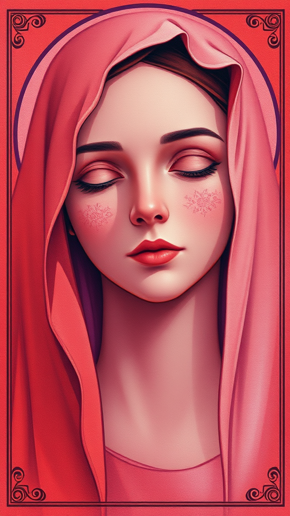 The ethereal depiction of Mary in a light red and purple palette, reminiscent of a tarot card, showcases exquisite and detailed facial features, drawing inspiration from Haifa Zangana and the art of Tonga. A realistic attention to detail permeates the piece, echoing the style of Ann Stookey, while small creative nuances add a fresh perspective to this captivating representation.