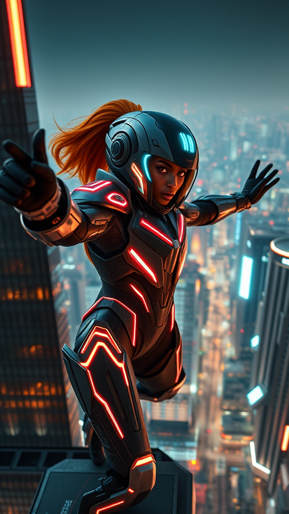 The film showcases a powerful black woman with striking ginger hair, poised dynamically on a skyscraper's edge, her arms elegantly stretched outward. Her armor, sleek and angular, has neon lights tracing its contours, pulsing rhythmically. Behind her, the sprawling neon-lit skyline of Neo-Tokyo stretches wide, as futuristic flying cars zip past in the backdrop. A close-up reveals her face, illuminated by a holographic display from her helmet, as she utilizes advanced sensors to vigilantly scan the cityscape for any signs of threat. Combining the cyberpunk flair of Blade Runner, the high-octane action of Starship Troopers, and the imaginative world-building akin to Pixar and Buzz Lightyear, this movie is directed by the visionary duo Ridley Scott and Ava DuVernay. Promising a visually arresting and gripping adventure, it centers around a strong and empowered black female lead. The film exhibits photorealistic, hyper-detailed visuals, with a focus on realistic textures, soft lighting, intricate skin details, and a cinematic analog style, set against the mesmerizing backdrop of a futuristic metropolis.