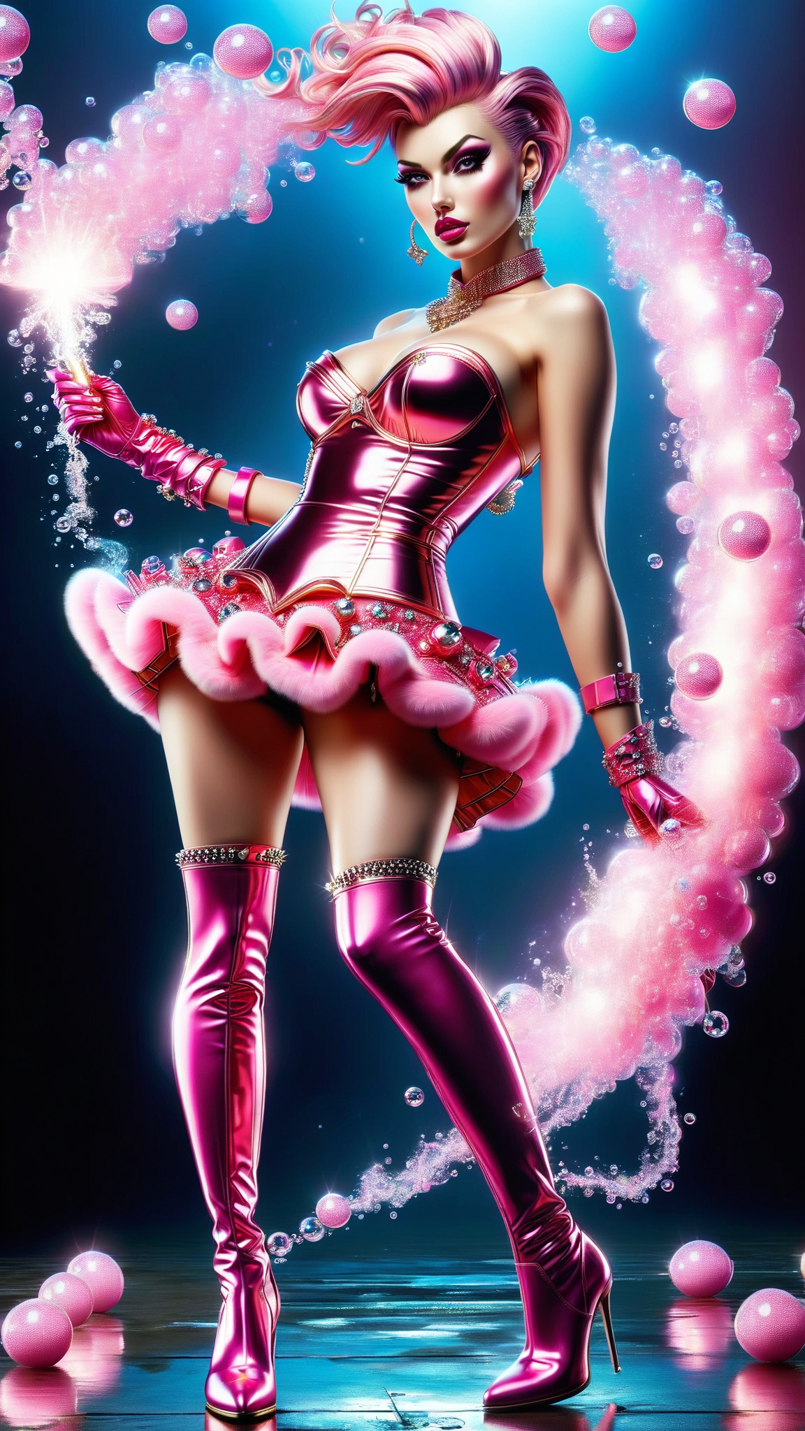 The fine line between Punk and Posh. Supervillain, Punk Rocker, rich girl. She has the ability to pull water vapor from the air to create bursts of fizzy pink bubbles that have the power to intoxicate people. She can also blast people with fizzy pressure. Caucasian female, feminine woman. Tall, strong, slim, athletic model. Punk edge. Pale skin, soft make-up in shades of pink. Beautiful face. Short hair, spiky style swept up, Bangs falling over to one side. Her hair is a soft strawberry pink, her eyes are magenta colored, and very seductive. Shocking pink minidress with cut-out designs. A pink leather belt with silver studs around her waist. Soft pink stockings on her shapely legs, and shocking pink knee-high boots with high heels. Full body pose. She is known as Pink Champagne, because she has the ability to produce fizzy pink bubbles from thin air. They are intoxicating.