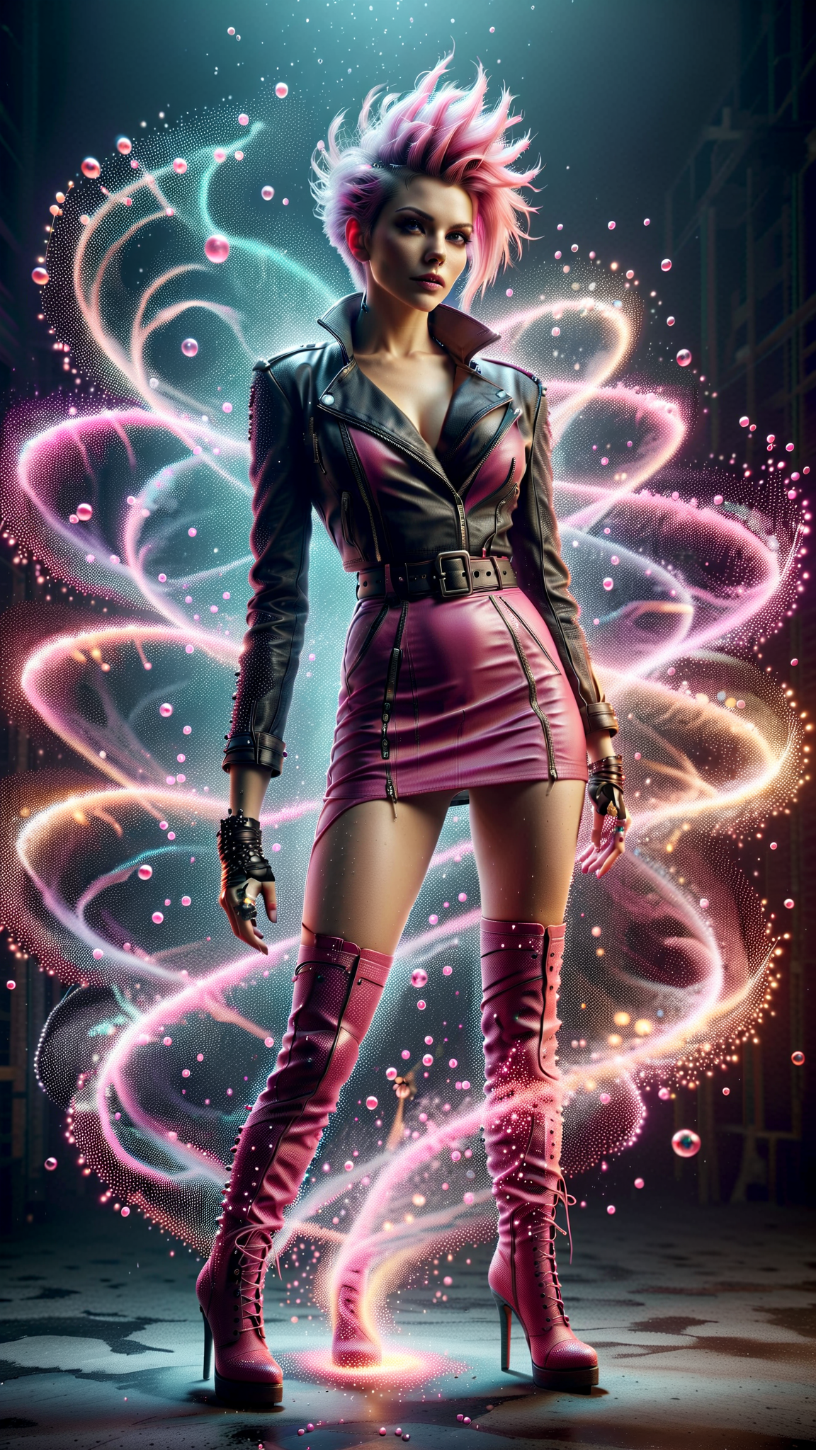 The fine line between Punk and Posh. Supervillain, Punk Rocker, rich girl. She has the ability to pull water vapor from the air to create bursts of fizzy pink bubbles that have the power to intoxicate people. She can also blast people with fizzy pressure. Caucasian female, feminine woman. Tall, strong, slim, athletic model. Punk edge. Pale skin, soft make-up in shades of pink. Beautiful face. Short hair, spiky style swept up, Bangs falling over to one side. Her hair is a soft strawberry pink, her eyes are magenta colored, and very seductive. Shocking pink minidress with cut-out designs. A pink leather belt with silver studs around her waist. Soft pink stockings on her shapely legs, and shocking pink knee-high boots with high heels. Full body pose. She is known as Pink Champagne, because she has the ability to produce fizzy pink bubbles from thin air. They are intoxicating.