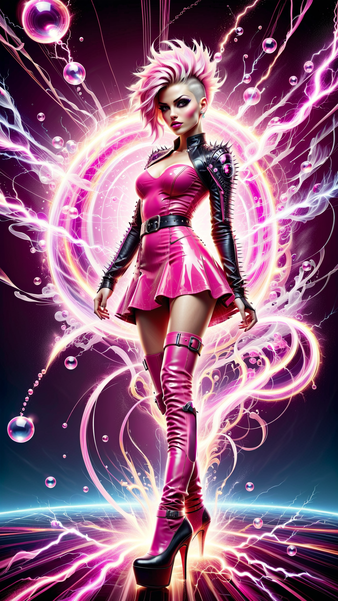 The fine line between Punk and Posh. Supervillain, Punk Rocker, rich girl. She has the ability to pull water vapor from the air to create bursts of fizzy pink bubbles that have the power to intoxicate people. She can also blast people with fizzy pressure. Caucasian female, feminine woman. Tall, strong, slim, athletic model. Punk edge. Pale skin, soft make-up in shades of pink. Beautiful face. Short hair, spiky style swept up, Bangs falling over to one side. Her hair is a soft strawberry pink, her eyes are magenta colored, and very seductive. Shocking pink minidress with cut-out designs. A pink leather belt with silver studs around her waist. Soft pink stockings on her shapely legs, and shocking pink knee-high boots with high heels. Full body pose. She is known as Pink Champagne, because she has the ability to produce fizzy pink bubbles from thin air. They are intoxicating.