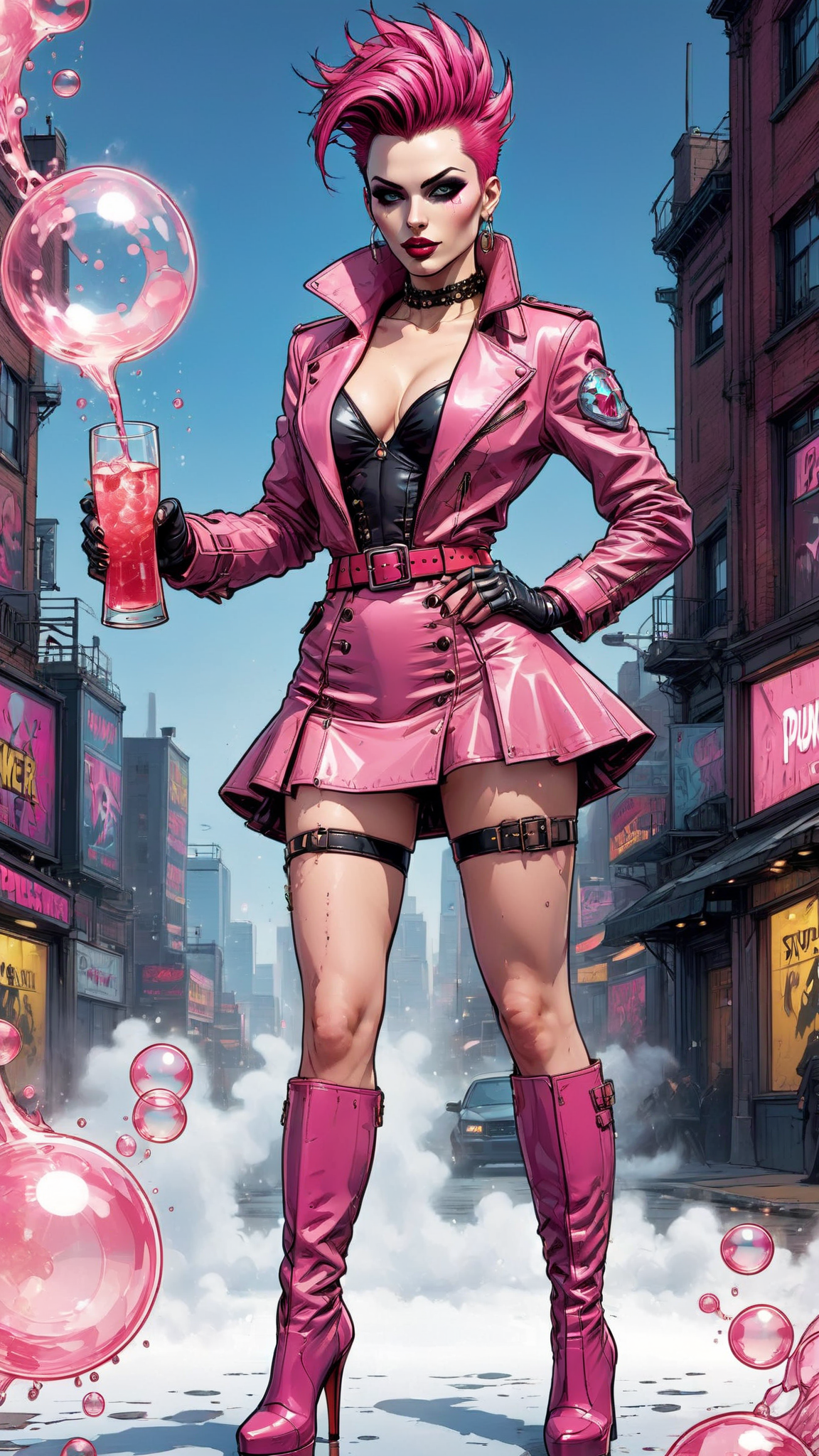 The fine line between Punk and Posh. Supervillain, Punk Rocker, rich girl. She has the ability to pull water vapor from the air to create bursts of fizzy pink bubbles that have the power to intoxicate people. She can also blast people with fizzy pressure. Caucasian female, feminine woman. Tall, strong, slim, athletic model. Punk edge. Pale skin, soft make-up in shades of pink. Beautiful face. Short hair, spiky style swept up, Bangs falling over to one side. Her hair is a soft strawberry pink, her eyes are magenta colored, and very seductive. Shocking pink minidress with cut-out designs. A pink leather belt with silver studs around her waist. Soft pink stockings on her shapely legs, and shocking pink knee-high boots with high heels. Full body pose. She is known as Pink Champagne, because she has the ability to produce fizzy pink bubbles from thin air. They are intoxicating.